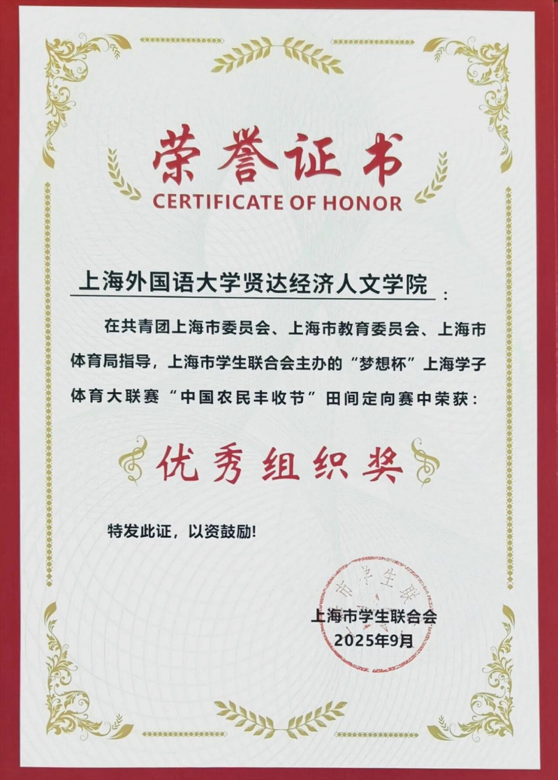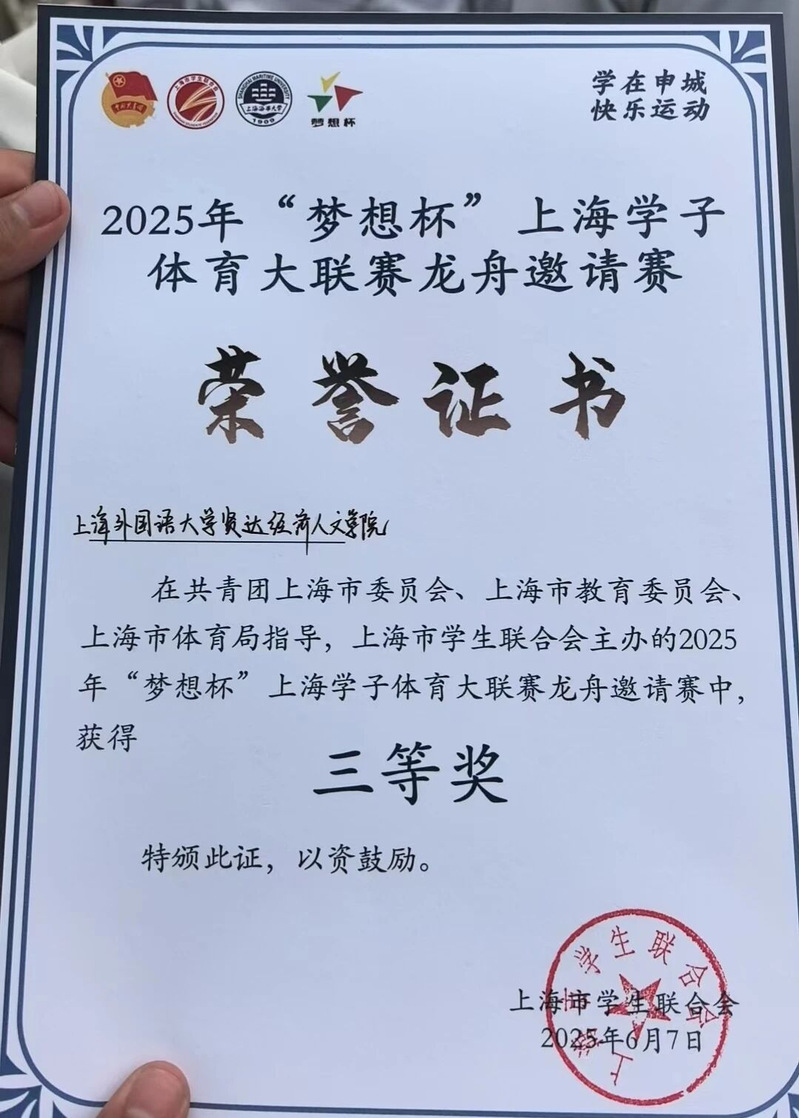 在“梦想杯”上海学子体育大联赛龙舟邀请赛暨民俗文化体验活动中,龙舟队成功斩获大赛三等奖的好成绩;在“梦想杯”上海学子体育大联赛“中国农民丰收节”田间定向赛活动中,我校获得大赛二等奖,同时获评“优秀组织奖”;在贤达学子在不同领域利用自身所学、所思、所感,绽放青春力量、展现贤达风采!
