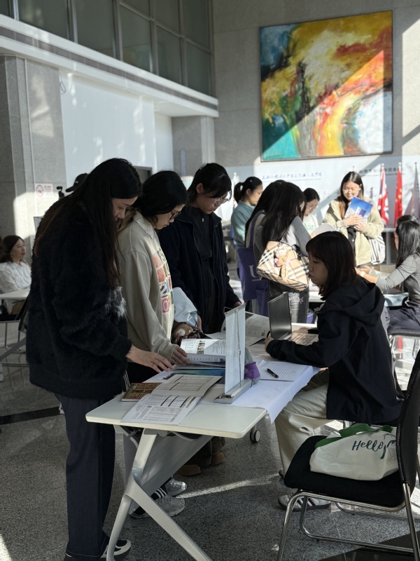 为助力我校学生精准把握海外升学机遇,高效冲刺理想院校,11月13日下午,我校国际交流合作处联合招生就业办公室在虹口校区行政楼大厅举办第三届海外硕士申请咨询交流会。活动特邀QS排名前200院校招生官亲临现场,面向我校大三、大四年级学生,围绕院校特色、留学费用、申请流程与录取标准等内容,提供一对一的专业咨询与深度指导,帮助学生明确目标、科学规划。