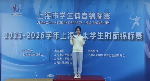 11月16日,上海市2025年大学生射箭锦标赛在上海对外经贸大学运动场圆满落幕。我校艺术与传媒学院的陈榆菲同学凭借过硬的技战术水平和强大的心理素质,斩获反曲弓女子个人30米项目铜牌,为学校赢得了荣誉。