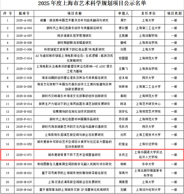 近日,根据上海市艺术科学规划领导小组办公室公示名单,我校许月兰老师申报的“城市更新背景下桥下艺术空间营造研究”课题成功获批立项资助。 本次全市共拟立项21项上海市艺术科学规划项目,其中我校喜获一项。本项目着眼于文化事业和文化产业发展实际,开展前瞻性、对策性应用研究,促进研究成果向实践转化,有效服务上海文化和旅游高质量发展。未来,科研处将鼓励更多教师积极参与科研项目申报,不断提升学校的科研水平和创新能力。供稿 | 科研处