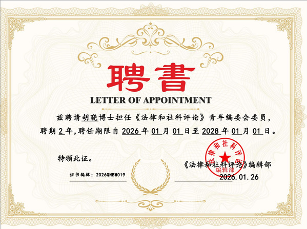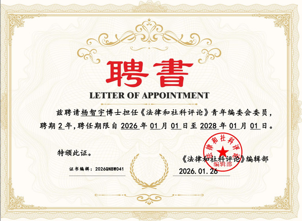 近日,我校商学院教师队伍建设再传佳音,法学系教师胡晓、杨智宇正式获聘为《法律与社科评论》青年编委会委员,聘期两年,自2026年1月1日至2028年1月1日。
