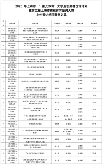 近日,由上海市科技艺术教育中心主办的2025年上海市“阳光体育”大学生志愿者优培计划暨第五届上海市高校体育新闻大赛圆满落幕。大赛聚焦体育新闻图文创作、影像记录等赛道,旨在培育青年志愿服务骨干,营造“阳光体育”社会氛围,是上海校园体育文化与新闻素养融合的重要实践平台。