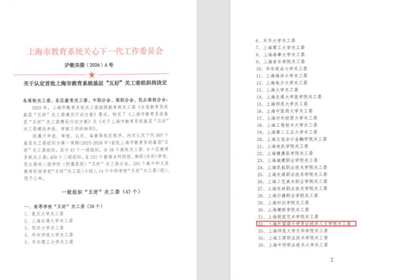 近日,上海市教育系统关心下一代工作委员会发布《关于认定首批上海市教育系统基层“五好”关工委组织的决定》,上海外国语大学贤达经济人文学院关工委成功入选首批“五好”关工委组织名单,这一殊荣标志着学校关心下一代工作迈向了新的高度,开启了育人工作的崭新篇章。